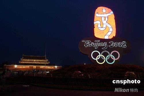 7月28日,天安门广场迎接奥运会花卉景观制作工作进入最后收尾阶段,用鲜花装点的“中国印”彩灯在晚上点亮,喜迎北京奥运会。 中新社发 富田 摄