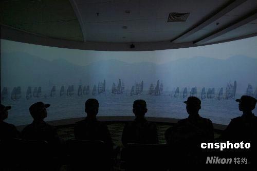 北京奥运会开幕日益临近,承担奥帆赛安保任务的青岛边防支队官兵利用值勤训练间隙参观奥帆中心展馆,了解奥运会及奥帆赛的相关知识。第29届奥运会帆船帆板比赛将于2008年8月9日至23日在青岛国际帆船中心及周边水域举行。 中新社发 王瑶 摄