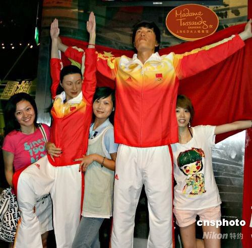7月29日,上海杜莎夫人蜡像馆,游客与新换了装的刘翔、郭晶晶蜡像合影。该蜡像馆紧跟形势,在北京奥运会中国体育代表团领奖服公布后,新近为刘翔、郭晶晶进行了换装,立刻引来游客的好奇,纷纷驻足观看并上前与之合影留念。中新社发 沈晨 摄