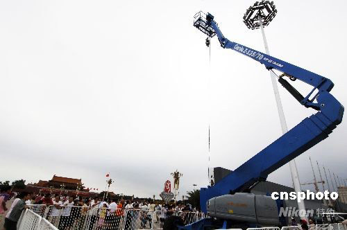 7月29日,美国一家电视台动用云梯空中拍摄天安门广场迎奥运盛况。据报道,北京在奥运会期间对天安门广场上的直播报道亮起绿灯,不过仅限于获得奥运转播权的官方电视公司。根据相关协议,外媒直播报道时段被安排在早上6点到10点以及晚上9点到11点。其他媒体也可以在天安门广场进行报道,但不能直播。 中新社发 王东明 摄
