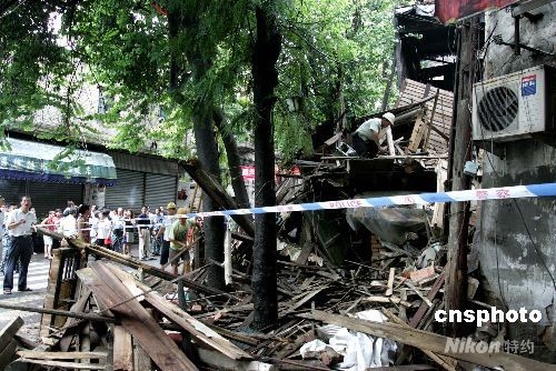 7月30日清晨,受今年第八号台风“凤凰”影响,福州市台江区隆平巷一两层木屋在雨中倒塌,当时屋内有一家3口,其中父子两人受伤。中新社发 小小 摄