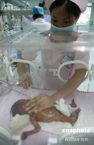 图为新生儿急救室,护士用棉签醮水喂睡在温箱里的袖珍女婴。7月30日,经过医护人员的全力救治,一个出生7天、比成人巴掌大不了多少、体重仅有750克的袖珍女婴,已度过危险期,在湖北襄樊市中心医院奇迹存活。据了解,该女婴是在襄樊打工的一对年轻夫妻所生,在母体内只待了26周多。7月23日晚,这个女婴在襄樊高新区一家医院出生后,呼吸困难,生命垂危,随后转至襄樊市中心医院救治。儿科医生称,目前袖珍女婴的生命体征稳定。如此轻的早产儿能够存活,在临床上十分罕见。中新社发 龚 波 摄