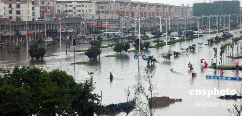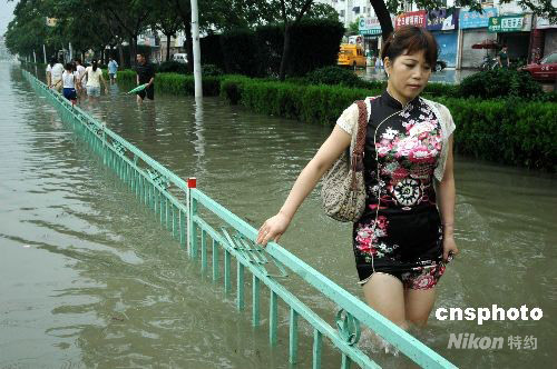 2008年7月31日20时起,受今年第8号台风 “凤凰”外围的云系和风力影响,“凤凰”雨袭击安徽巢湖市。至8月1日15时,“凤凰”雨狂袭安徽巢湖市城区,降雨量已超过240mm以上,造成市内多处低洼地段发生严重内涝,部分街道成了一片汪洋,大部分路段被水淹没,进入市区的高速路口因积水过深临时封闭,给群众出行和生活带来了很大影响。此次长时间的强降水,给该市城区防洪排水带来压力。中新社发 徐振华 摄