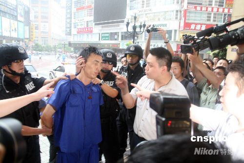 8月2日下午,重庆市解放碑商业区一百货大楼遭爆炸恐吓,警方接警后五小时内成功将犯罪嫌疑人抓获,并经排查该大楼暂未发现可疑物品。图为重庆警方将犯罪嫌疑人带往该大楼,该商场保安对犯罪嫌疑人进行指认。中新社发 周阳 摄