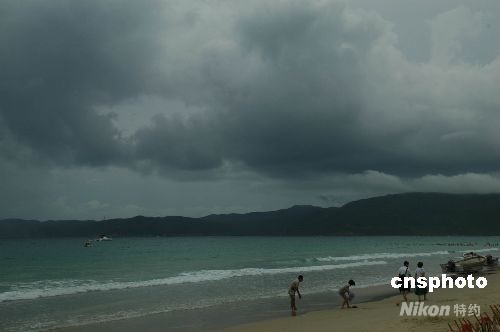 8月6日,受强热带风暴“北冕”影响,海南三亚亚龙湾国家旅游度假区上空乌云密布,降雨不断,沙滩上的游人相较往日有所减少。中新社发 尹海明 摄