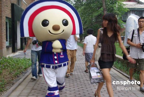 8月13日,中华台北棒球队吉祥物OPEN小將亮相北京,引起游客极大兴趣和好奇。中新社发 九州 摄