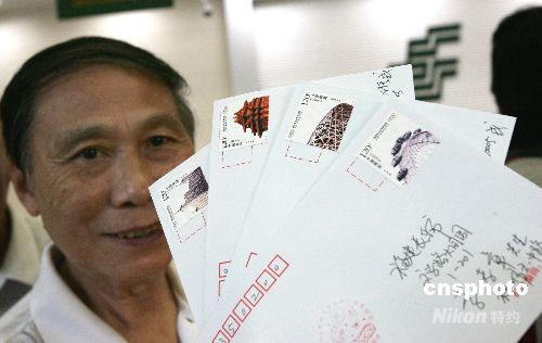八月二十四日上午,北京奥运会最后一天,一位老伯在福州市邮电大楼高兴地拿着刚买到的《奥运会从北京到伦敦》纪念邮票。《奥运会从北京到伦敦》纪念邮票,由中国国家邮政局和英国邮政联合发行。 中新社发 杨婀娜 摄