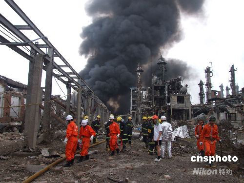 8月26日6时许,广西宜州市郊的广西维尼纶集团有限责任公司车间发生爆炸并引发大火,截至当日15时30分,医院收治伤员增加至55人,死亡人数增至5人,失去联系人员减至14人。 中新社发 杨继武 摄