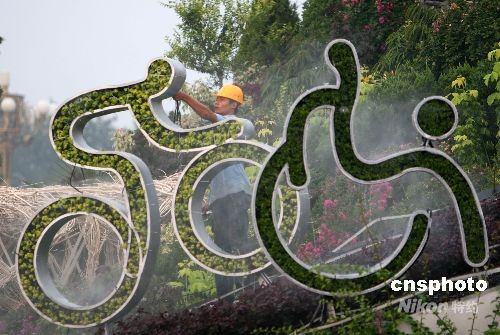 2008年8月27日,工作人员在天安门广场布置残奥会景观,更换新鲜花卉。为迎接即将于9月6日开幕的北京残奥会,天安门广场北京残奥会景观布置工作正在加紧进行中。中新社发 鲁谷 摄