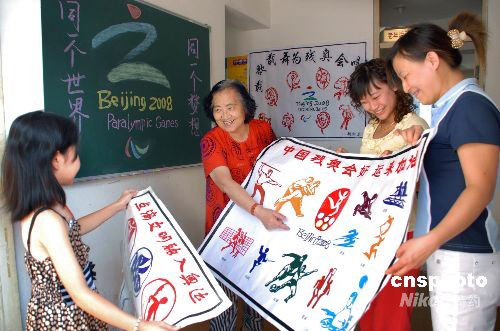 辽宁锦州市七旬老人魏淑烈在残奥会召开之即,按照残疾运动员各项比赛项目,采用剪纸方式一一剪出,为残奥会运动员加油。图为魏淑烈老人在介绍她的剪纸。中新社发 谷进 摄