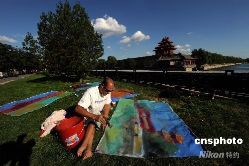 8月31日,北京天气晴朗蓝天中漂浮着朵朵白云,新加坡籍残疾人Gregory Burns坐在故宫北门外的绿地上为蓝天白云下的北京城作画。中新社发 廖攀 摄