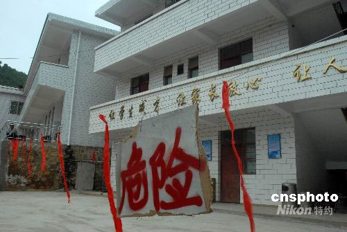 9月1日,受“8·30”地震余震影响,四川省攀枝花市决定所有中小学开学时间推迟一周,将于9月8日开学。图为攀枝花市盐边县和爱乡中学一栋教学楼在地震中因受损严重,拉起红色警戒线。中新社发 石雨 摄