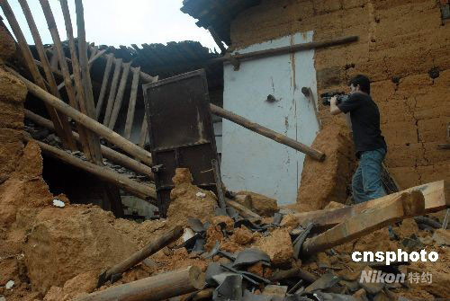 图为一记者在攀枝花市顺利村一完全跨塌的民房前拍摄。