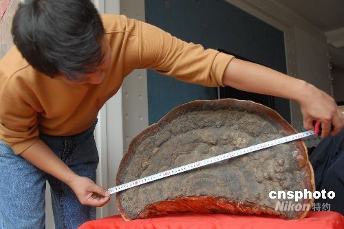 9月1日,黑龙江海林市民李先生家中,一株直径61厘米、宽42厘米、重9.5斤的巨型野生灵芝。据李先生介绍经省医药专家鉴定,认为形体这么大的野生灵芝最少也得生长百年以上,而且品相这么好实属罕见。中新社发 高福贵 摄