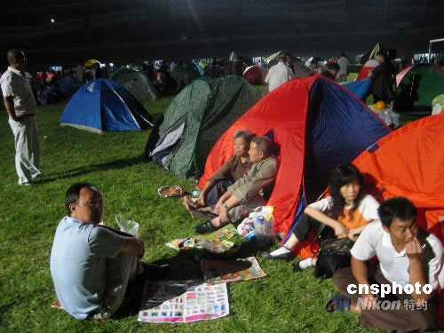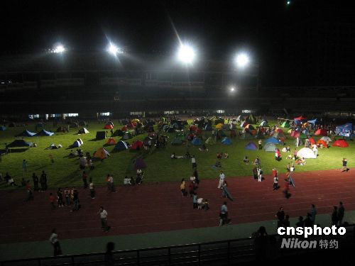 九月一日晚,上千名攀枝花市民在攀枝花体育场搭帐篷过夜。因害怕再次发生余震,许多市民从家里搬到了体育场内。体育场已免费向市民开放,并二十四小时提供热水。中新社发 刘子倩 摄