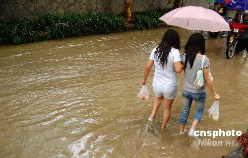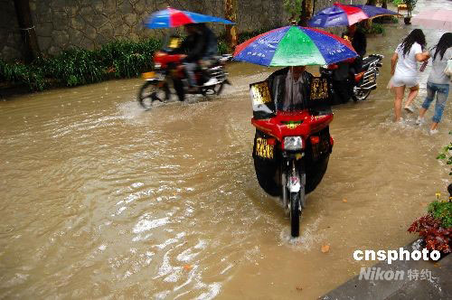 9月10日,重庆市合川区遭遇强暴雨袭击,部分道路变成“河流”,给当地交通造成较大影响。重庆市持续几日的闷热天气,也被这场顷刻降下的暴雨给打破,使气温迅速回落,送来一阵凉爽的秋意。中新社发 许康平 摄