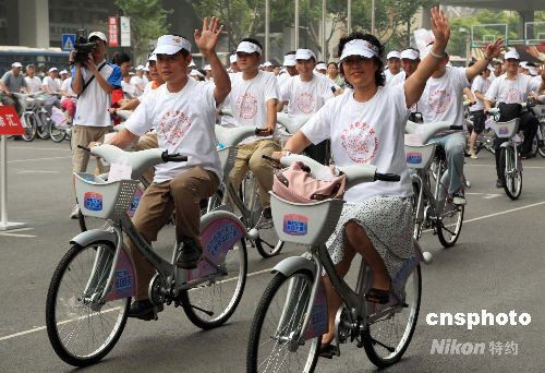 9月12日,上海诞生首个礼仪单车队,600名“迎世博文明礼仪宣传员”以自行车为绿色出行工具,带头遵守文明规范,示范文明礼仪。中新社发 潘索菲 摄