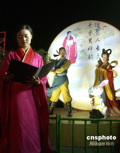 9月12日,一年一度中秋赛诗会在上海老城隍再度上演,手持折扇,身着汉服,摇头晃脑地吟诵自己所做的诗作,回归传统的中秋赛诗会映着中秋圆月,吸引大量沪上大学生参与其中。中新社发 李佳佳 摄