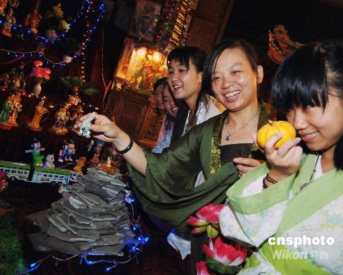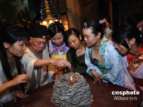 9月13日,五十多名福建汉服爱好者在福州名胜裴仙宫举行摆塔庆中秋,重现福州民俗。据传“摆塔”源于明嘉靖年间戚继光奉命来闽抗倭,连打几场大胜战。有一次正逢中秋节,为庆祝胜利,人们把古玩等摆在厅堂供人欣赏。过去福州的塔比较多,摆设品多为古塔状,故称“摆塔”。中新社发 刘可耕 摄