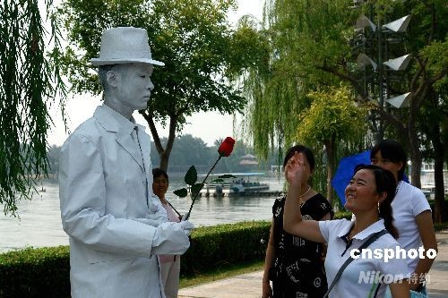 9月14日,在天津水上公园中秋游园会上,由四人组成的人体活雕塑展成了亮点。这些人体活雕塑在进行表演的同时,还与游客合影、互动,给中秋游园会增添了靓丽风景。中新社发 展晓仁 摄