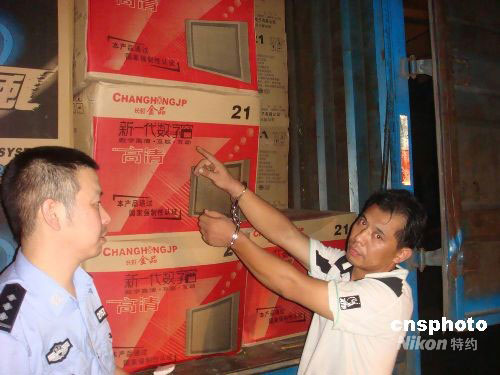 9月18日下午,绵阳市公安局和四川长虹电器股份有限公司联合举行新闻发布会,披露近期在安徽省查获一起大量假冒长虹彩电的伪劣商品案件,绵阳市公安局已于9月11日在广东省广州市白云区捣毁该大型造假地下黑工厂。图为犯罪嫌疑人朱西旺(右)归案后指认假冒长虹彩电。中新社发 岳波 摄