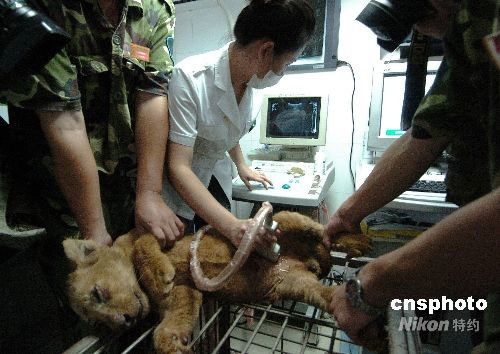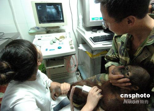 9月24日下午,杭州一家动物医院为杭州野生动物园的一只幼年非洲狮和两只幼年红毛猩猩进行肾结石检查,检查结果,这三只小动物均有轻度至中度的肾结石症状。 据了解,该动物园近两年来一直选用“三鹿”牌奶粉辅助喂养部分动物幼崽,今年上半年以来,喂食奶粉的幼年狮、虎、猩猩、绒猴等普遍出现排尿淋漓,尿液发黄、浑浊,营养不良等症状。中新社发 施健学 摄