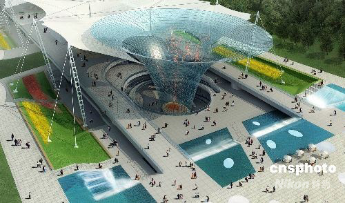 2010年上海世博会中央景观道路“世博轴”进入全面施工阶段,图为首次公布的“世博轴”主出入口“阳光谷”造型效果。据介绍,“世博轴”的一端也是上海世博园区的主出入口,整个“世博轴”在入口及沿途共设6个巨型圆锥状“阳光谷”。“阳光谷”采用钢结构,其功能是让自然光透过透明“圆锥”倾泻入地下,满足部分地下空间的采光,实现节能环保。 中新社发 世博局 摄