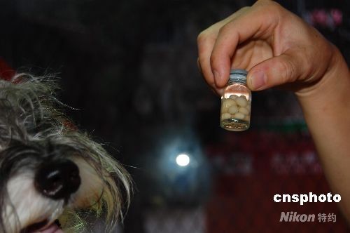 9月26日,广西南宁一家宠物医院的医生展示一个小狗手术后取出的十余颗结石。小狗主人陈女士介绍说,该小狗未满一岁,出生后由于体弱,主人就给它喂食三鹿奶粉,后来也曾食用过少量伊利奶粉,小狗三个月时出现排尿困难,之后去宠物医院诊治,至今已经导尿二十余次,做结石手术三次,共发现几十颗结石,最近一次手术在十天前进行,发现十余颗结石,最大的结石如同花生粒一般。医生说,这是他从医十多年第一次见这么小的狗患结石,也是他所见到的最大的公狗结石,结石的原因与食用奶粉可能存在很大关系。 目前,小狗主人已经停止给小狗喂食奶粉。中新社发 刘万强 摄