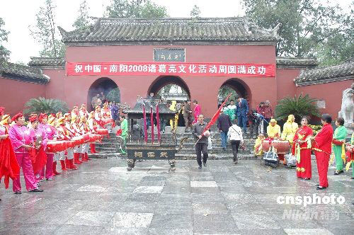 9月27日(农历八月二十八)是我国古代著名政治家、军事家诸葛亮仙逝1774年忌日,也是明代世宗皇帝钦定的南阳卧龙岗祭拜诸葛亮的秋祭日。当天上午,以弘扬诸葛亮“鞠躬尽瘁,死而后已”精神为主旨的“中国南阳2008纪念诸葛亮文化活动周”在诸葛亮躬耕地——南阳市卧龙岗武侯祠隆重开幕,吸引众多国内外的专家、学者和游客前来参观、朝圣和游览。9月27日至10月2日“诸葛亮文化周”期间,武侯祠将举行大型民间艺术表演、汉代乐舞表演、画家走进卧龙岗、三国谜语有奖竞猜、品尝三国文化宴等丰富多彩的活动。中新社发 熊运彬 摄