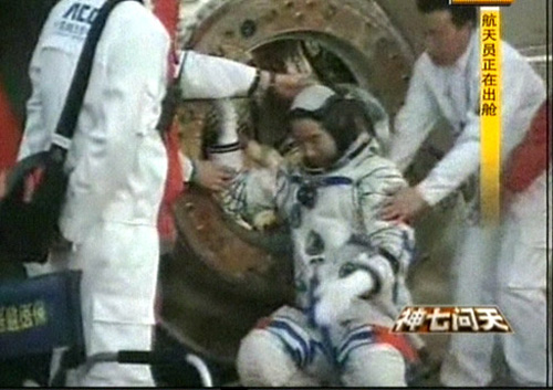 9月28日,神舟七号飞船返回舱顺利着落,三名航天员翟志刚、刘伯明、景海鹏在经过15-20分钟的重力再适应后全部出舱。首先出舱的是翟志刚,第二个出舱的是刘伯明,第三个出舱的是景海鹏。
