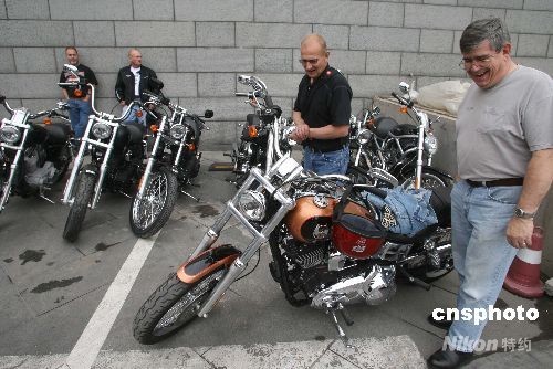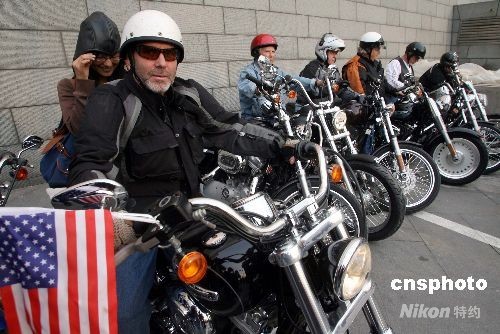 2008年9月28日,来自美国哈雷俱乐部的13名成员抵达山东济南,为“哈雷山东行”做准备。据了解,“哈雷山东行”活动共有13名哈雷俱乐部的成员参与,他们将在12天里驾驶摩托车游览济南、青岛、烟台、潍坊、济宁、泰安六个城市,行程约1500公里。中新社发 龚辉 摄