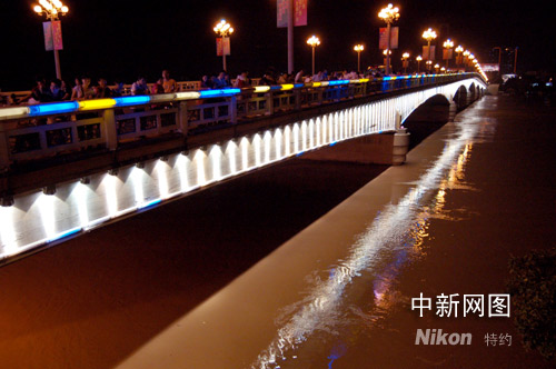 9月29日晚上,广西南宁众多市民和游客争睹8年来邕江最大洪水。受今年第14号台风“黑格比”的影响,最近几天广西江河水位不断上涨,9月30日凌晨4时,邕江8年以来最大洪峰通过南宁,最大洪峰水位达到75.89米,超出警戒水位2.89米,沿江两岸大堤下许多树木和路灯被淹没。由于8年前南宁修筑了高规格的防洪大堤,因此此次洪峰对南宁主城区没有影响,但对下游邕宁区造成严重影响。目前,邕江水位开始缓慢回落。由于洪水适逢国庆假期,许多市民和游客到江边争睹滔滔江水。中新社记者 刘万强 摄