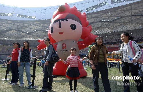 9月30日,“十一”国庆长假第二天,旅游黄金周进入高潮,到北京旅游的各地游客都渴望进入北京奥运会主体育场“鸟巢”,有幸购到参观票的游客在鸟巢尽情玩耍拍照。 中新社发 邹宪 摄