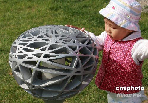 9月30日,“十一”国庆长假第二天,北京奥林匹克公园里人流如织,一小童对“小鸟巢”深感兴趣。黄金周期间,奥林匹克公园正式向公众开放,民众可近距离接触“鸟巢”、“水立方”、奥林匹克中心区、森林公园等。中新社发 郑雄增 摄