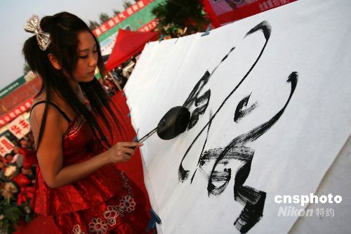 9月30日,女青年韩琳为市民表演用勺子写字特技。河南许昌市民韩淋自幼喜好书法,但与常人不同的是,她喜欢用勺子、筷子等物品写字,被人称为“特技书法”。中新社发 牛书培 摄