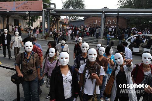 十月一日,国庆长假第三天,北京七九八艺术节如火如荼,一群北京青年戴着面具参观七九八艺术区。七九八艺术节时值国庆长假,众多北京市民改变度假观念前往七九八艺术区感受前卫艺术热潮。中新社发 廖攀 摄