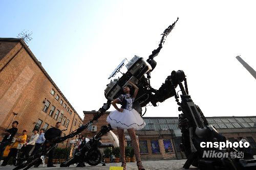一位窈窕淑女在名为“肇事者”的变形金刚装置作品前。