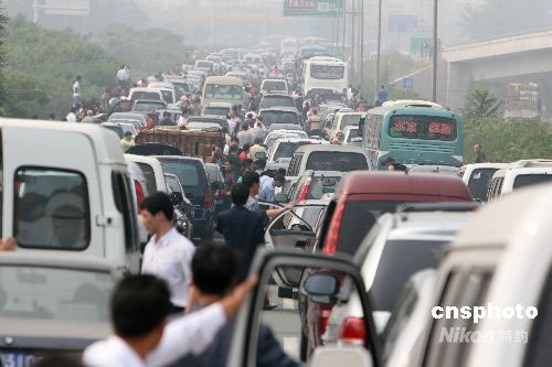 2008年10月1日,北京八达岭高速公路出现爆堵。受出游车辆过多影响,中午12点之后,北京昌平西关到八达岭水关路段几近瘫痪,驾乘人员纷纷走出车外等候通车,甚至有人在路中间打球、打扑克以打发时间。中新社发 鲁谷 摄