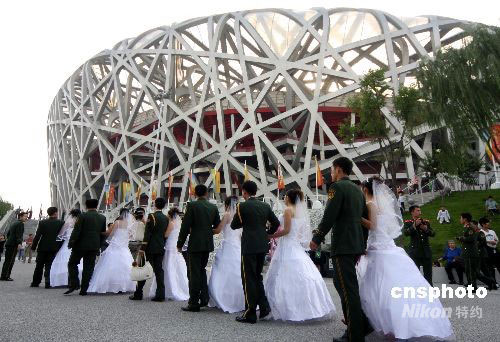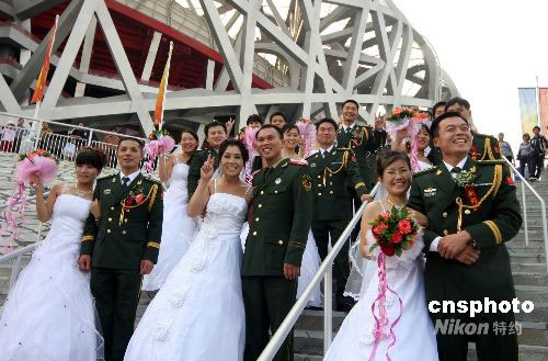 9月30,喜结良缘的奥运安保武警与新娘在国家体育场“鸟巢”前集体留影。当天,武警十三支队21位奥运安保武警在数次推迟婚期后,终于步入婚姻殿堂。据了解,这21位武警战士从今年初开始就没有休过一天假,原定的婚期一拖再拖,直到奥运结束后,才定为国庆节期间完婚。中新社发 吴芒子 摄