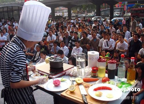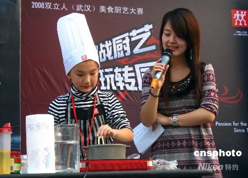 2008年10月1日,武汉市汉口航空路一厨艺大赛现场,11岁女童余秋萍上台和成年人一起比赛烹调技艺。据了解,小学生余秋萍从9岁就开始学习厨艺,经常在家炒菜做饭,认为自己的手艺不错,就报名参加了这次比赛。中新社发 孙新明 摄