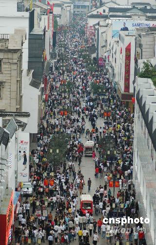 2008年10月4日,“十一”黄金周已进入第六天。苏州旅游的热度出现“井喷”态势,闹市苏州观前街人如潮涌。中新社发 朱子寒 摄