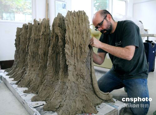“十一”黄金周期间,来自美国、希腊、韩国、阿根廷等7个国家的16名陶艺大师会聚山东省淄川李梓源艺术中心切磋技艺,展示陶艺绝活。图为美国檀香山夏威夷大学副教授、陶艺家布莱德·伊万·泰勒正在创作作品。中新社发 闫盛霆 摄