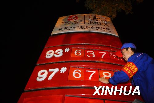 10月7日凌晨,北京一加油站的工作人员在更换汽油价格标签。当日零时,北京汽油价格上涨,93号汽油涨至每升6.37元,97号汽油涨至每升6.78元。新华社记者 邢广利 摄