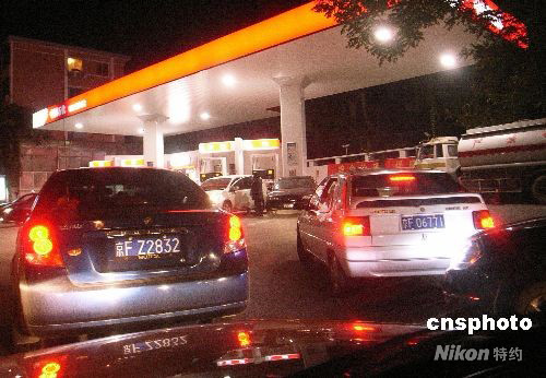 北京发改委发布成品油价格调整通知,自10月7日零时起,北京汽、柴油标准品零售基准价格每吨分别上调200元和290元。10月6日晚,北京各个加油站等待加油的汽车排成长龙。中新社发 任晨鸣 摄