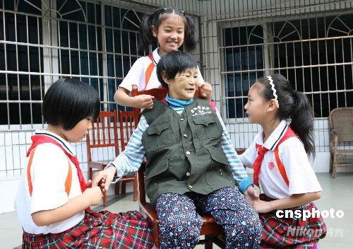 10月7日,由四川省广安市广安区东方小学的10多名少先队员组成的爱心志愿者小分队来到浓洄敬老院,看望生活在这里的40多位老人,为老人送上节日礼物,为老人打扫房间,陪老人聊天、散步,为他们送去重阳节的祝福,陪伴他们度过灾后首个重阳节。 中新社发 杜修战 摄