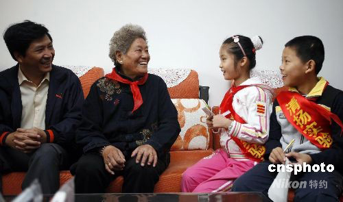 10月7日重阳节,无锡市清扬实验小学为提高少先队员尊老、敬老、爱老意识,进一步营造全社会尊老爱老氛围,结合“喜看家乡改革开放30年巨变”,开展“和谐小使者访名人”活动。在世界上第一个从北坡登上珠峰的女英雄——潘多的家中,无锡市清扬实验小学的少先队员们与潘多奶奶面对面地交流着。潘多奶奶勉励少先队员要在学习上要发扬“攀登”精神,克服困难,勇攀学习高峰。 中新社发 张浩 摄