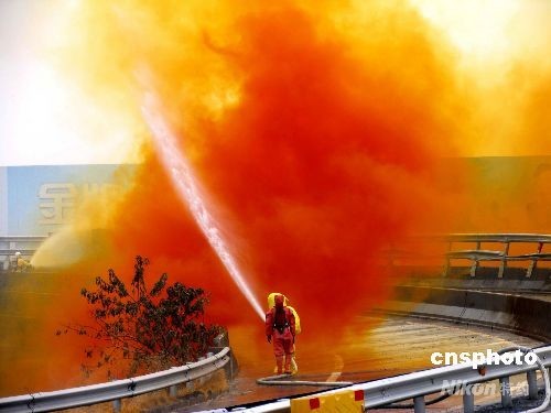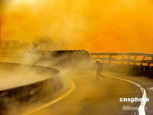 10月7日10时11分,位于杭甬高速公路宁波段塘出口处,一装载29吨硝酸的槽罐车在自西向东行驶过程中,撞击护栏后侧翻,发生泄露事故。中新社发 何蒋勇 摄