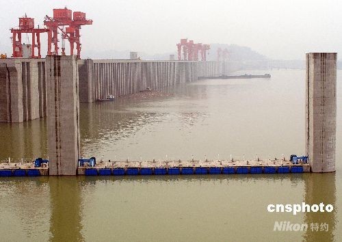 2008年10月7日,经过近10天持续不断地蓄水,三峡工程大坝坝前水位达到155.5米,并保持在该水位以上运行,实现了2008年汛后先期蓄水至156米水位的目标,是否向175米水位抬升尚需再检测并研究三峡大坝运行情况、三峡库区地质灾害状况等之后再做决定。按设计要求,三峡工程分135米、156米、175米三个水位进行蓄水。此前,三峡工程已于2006年、2007年两次蓄至156米水位高程。中新社发 刘君凤 摄