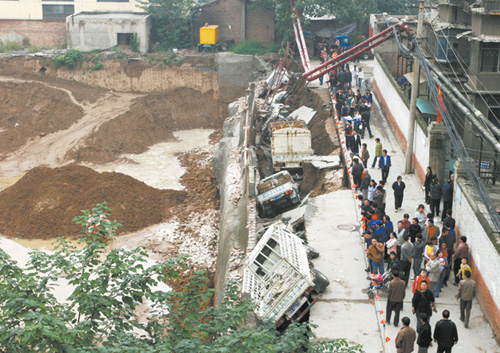 10月8日11时45分左右,位于西安市新城区长缨东路的北张家庄村里,一处长约70米的道路突然发生大面积塌陷,坍塌面积大约有300平方米,造成停放在公路上的9辆货运汽车瞬间掉入了深约3米的坑中。路面塌陷过程中,附近群众都以为是地震了,遂四散逃离。该起事故没有造成人员伤亡,塌陷原因目前正在调查当中。