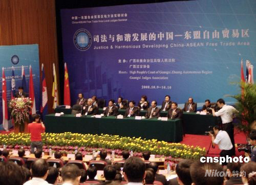 十月九日,中国—东盟自由贸易区地方法官研讨会在广西南宁开幕。来自柬埔寨、老挝、缅甸、新加坡等东盟国家及中国的八十余位高级官员、资深法官和法律实务工作者,以“司法与和谐发展的中国-东盟自由贸易区”为主题,围绕民商事审判法律与实务、司法协助、法官培训与交流等进行探讨和交流。 中新社发 黄艳梅 摄